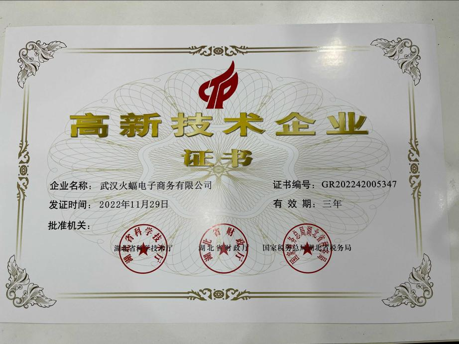 ▲火蝠電商「高新技術(shù)企業(yè)證書(shū)」