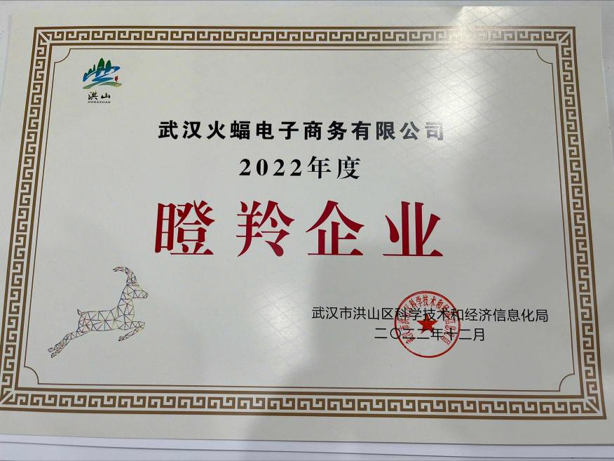 ▲火蝠電商「瞪羚企業(yè)」認(rèn)證證書(shū)