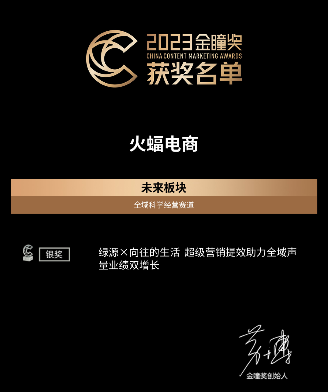 據(jù)了解,金瞳獎(2011——至今)是由中國商務(wù)廣告協(xié)會(CAAC)指導(dǎo),傳播行業(yè)平臺“廣告門”主辦,對內(nèi)容及內(nèi)容營銷領(lǐng)域進行商業(yè)價值認(rèn)定的權(quán)威獎項。本屆金瞳獎共設(shè)置「原創(chuàng)內(nèi)容」、「內(nèi)容營銷」、「未來板塊」三大獎項單元,讓更多符合時代需要、引領(lǐng)行業(yè)發(fā)展的好內(nèi)容、好作品有機會被行業(yè)看見、了解和學(xué)習(xí)。評審團匯集了來自代理公司、頭部互聯(lián)網(wǎng)營銷平臺及品牌方在內(nèi)的140余位行業(yè)影響力人物,對1211件入圍作品進行激烈討論和評選。火蝠電商憑借創(chuàng)意力與洞察力榮獲2023金瞳獎【最具數(shù)智經(jīng)營力品牌——銀獎】榮譽,并攜手品牌方—