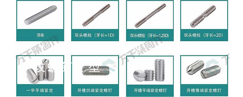 平杯)、半圓頭內六角螺釘(圓杯)、十字槽盤頭機螺釘、十字槽沉頭機螺釘、十字槽大扁頭機螺釘、十字槽盤頭自攻釘、十字槽沉頭自攻釘、十字槽大扁頭自攻釘、全牙絲桿(牙條)、六角螺母、法蘭螺母、尼龍螺母、蓋型螺母、蝶型